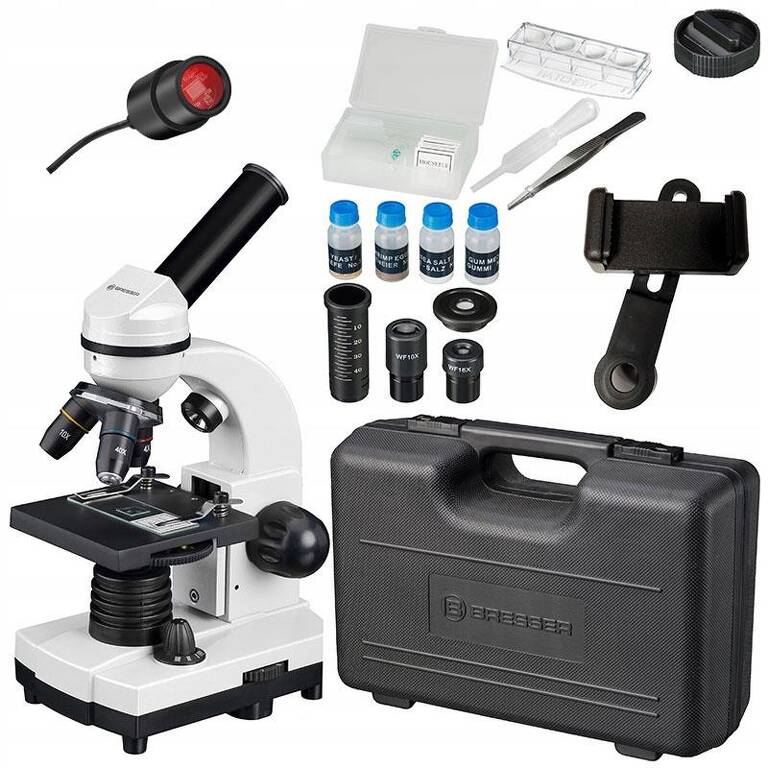 Bogate wyposażenie w postaci gotowych preparatów, czystych szkiełek podstawowych i nakrywkowych oraz narzędzi: takich jak gilotyna, pęseta, mieszadełko, skalpel pozwala na przygotowywanie własnych preparatów. Na wyposażeniu także takie pomoce jak probówka i szalka Petriego do przechowywania obiektów do obserwacji. Mikroskop wyposażono także w fotoadapter do smartfonów umożliwiający wykonywanie zdjęć i nagrywanie filmów z użyciem smartfonów. Na wyposażeniu mikroskopu znajduje się także kamera o rozdzielczości 2 mln pixeli umożliwiająca podgląd w czasie rzeczywistym oglądanych obrazów na monitorze komputera Wyposażenie: Oświetlenie górne i dolne Regulacja natężenia oświetlenia Łapki do mocowania preparatów Kolorowe filtry na obrotowej tarczy pod stolikiem Zestaw preparatów Zestaw szkiełek do przygotowywania preparatów Gilotyna Pęseta Mieszadełko Skalpel Probówka Szalka Petriego Jaja skorupiaków Sól morska Wylęgarnia Kamera Full HD 2MP Walizka z tworzywa Lista preparatów: 1. Epidermis onion – skórka cebuli 2. Pine mature wood – kora dojrzałej sosny 3. Cotton stem – Bawełna, łodyga, przekrój poprzeczny 4. Housefly leg – Noga muchy Wyposażenie: – kamera Full HD – oprogramowanie CamLabLite (do pobrania) – kabel USB 5. Stem of Wood Dicotyledon – Łodyga rośliny dwuliściennej |