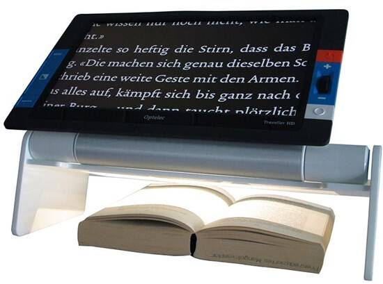 Podstawka do czytania do powiększalnika Traveller HD umożliwia wygodne czytanie książek, dokumentów i czasopism o grubości do 5 cm.