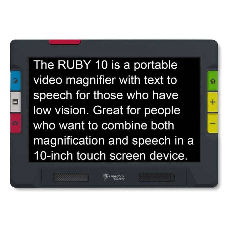 Lupa elektroniczna Ruby 10 posiada 10-calowy ekran dotykowy, przyciski ekranowe i przyciski fizyczne, zaawansowane tryby wyświetlania, wbudowany akumulator, własne oświetlenie, rozkładaną podstawkę do czytania i trzy dedykowane kamery, dwie z tyłu obudowy i jedną na wysuwanym ramieniu. Istnieje możliwość zakupienia droższej wersji Ruby 10 z mową syntetyczną i OCR.