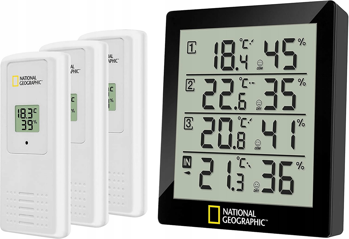 Stacja pogodowa National Geographic to nowoczesne bezprzewodowe centrum meteorologiczne dostarczające informacji na temat temperatury i wilgotności z 4 punktów pomiarowych.